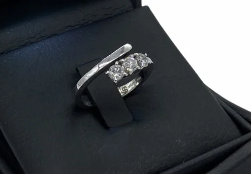 Questo anello Trilogy a coda di serpente fa parte della collezione De Stefano. Anello in oro bianco 18 kt, a coda di serpente (tipo contrarié) con 3 diamanti incastonati a regola d’arte dai nostri maestri orafi, per un totale di carati 0,60, colore H.